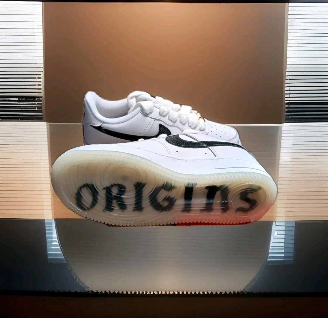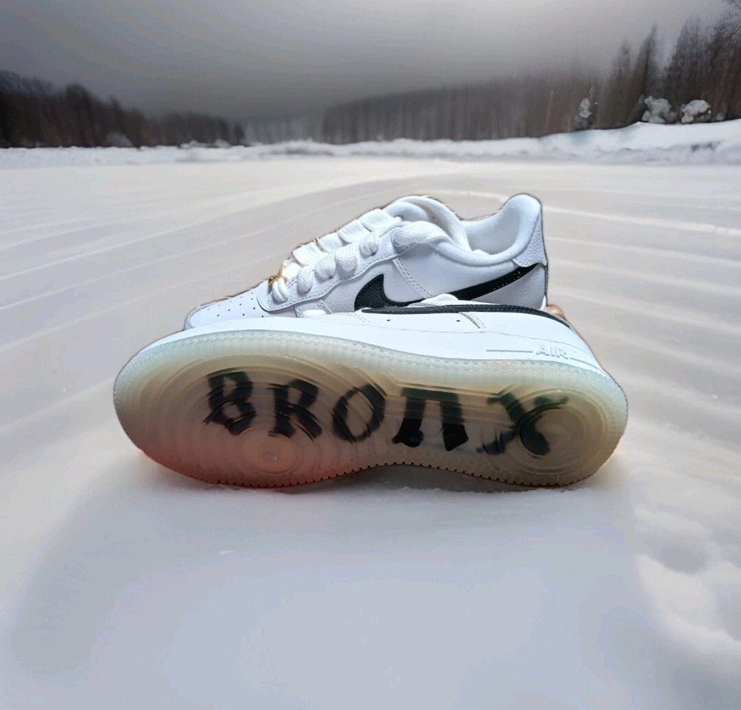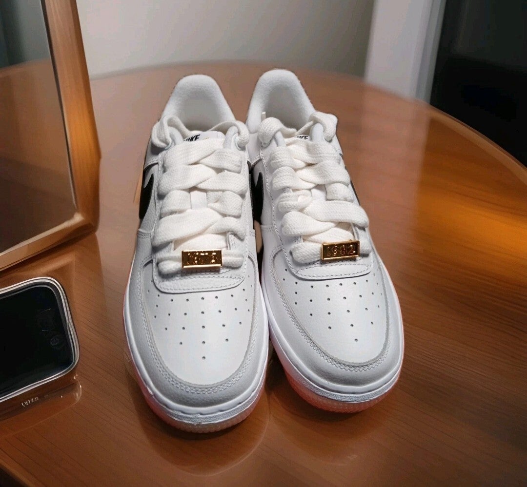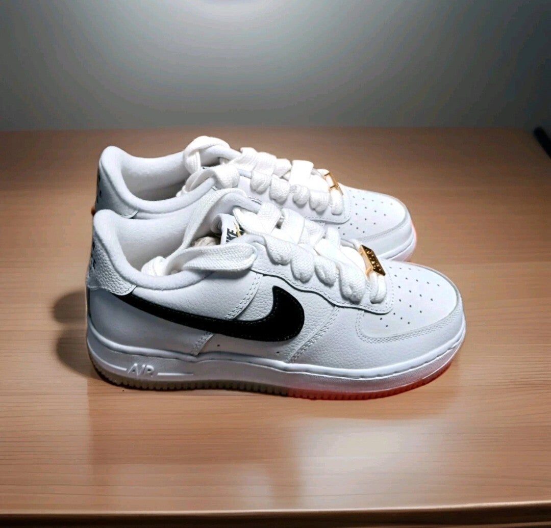 Nike Air Force '07 Bronx Origins In White Leather And Black Trim With Bronx Origins Written On The Bottom Of The Soles Comes In A Unisex Size 5y Perfect For Boys Or Girls Style Code DX2309-100